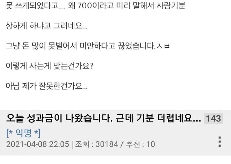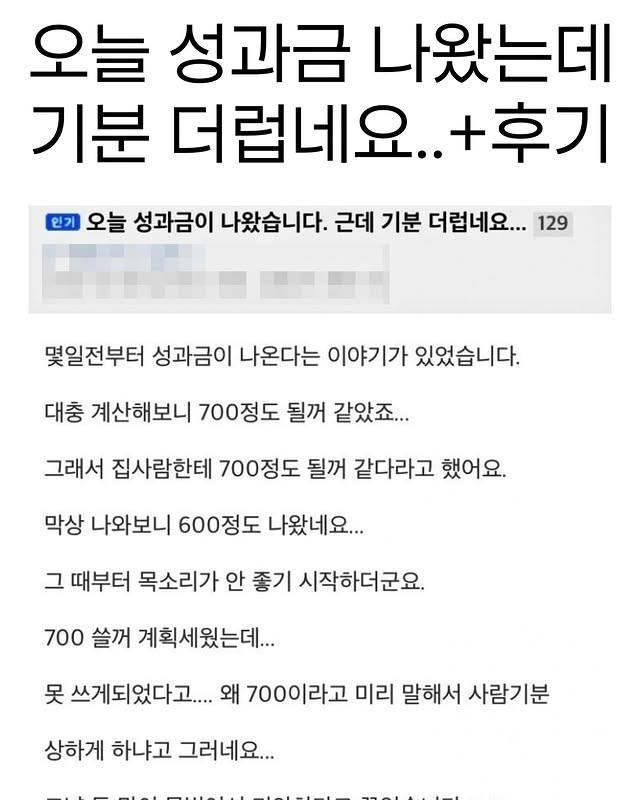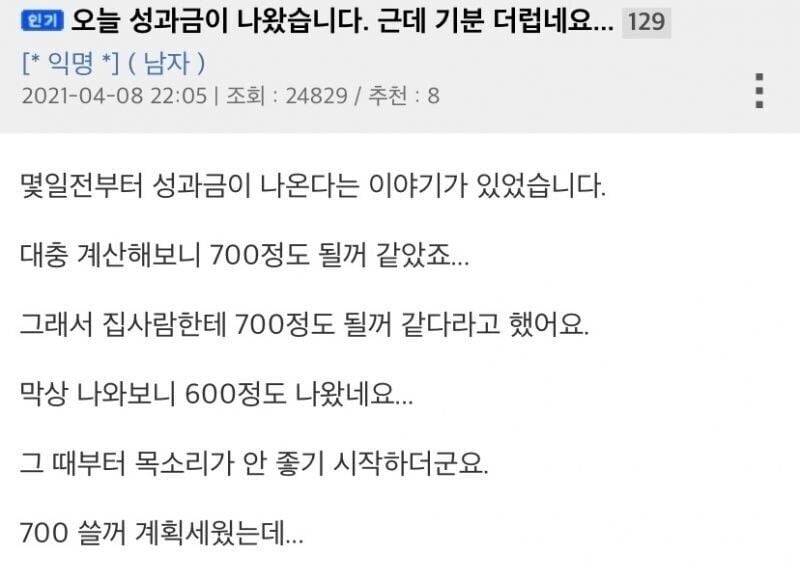 유머오늘 성과급 나왔는데 기분 더럽네요...(+후기)위키뉴스 기자입력북마크공유가글자크기프린트댓글오늘 성과금 나왔는데 기분 더럽네요… 위키뉴스 기자[email protected]카카오톡페이스북트위터밴드URL복사