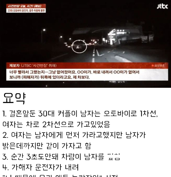 1. 결혼앞둔 30대 커플이 남자는 오토바이로 1차선, 여자는 차로 2차선으로 가고있었음