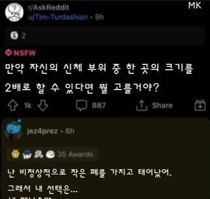 유머신체 부위 중 하나를 크게 할 수 있으면 뭘 고를거야?위키뉴스 기자입력북마크공유가글자크기프린트댓글신체 부위 중 하나를 크게 할 수 있으면 뭘 고를거야?위키뉴스 기자[email protected]카카오톡페이스북트위터밴드URL복사