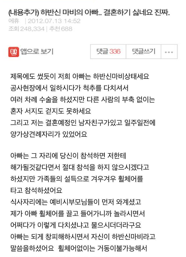 하반신 마비의 아빠.. 결혼하기 싫네요 진짜.....