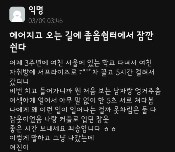 리와인드뉴스여친 자취방 갔다가 헤어지고 온 에타인위키뉴스 기자입력북마크공유가글자크기프린트댓글 여친 자취방 갔다가 헤어지고 온 에타인 위키뉴스 기자[email protected]카카오톡페이스북트위터밴드URL복사