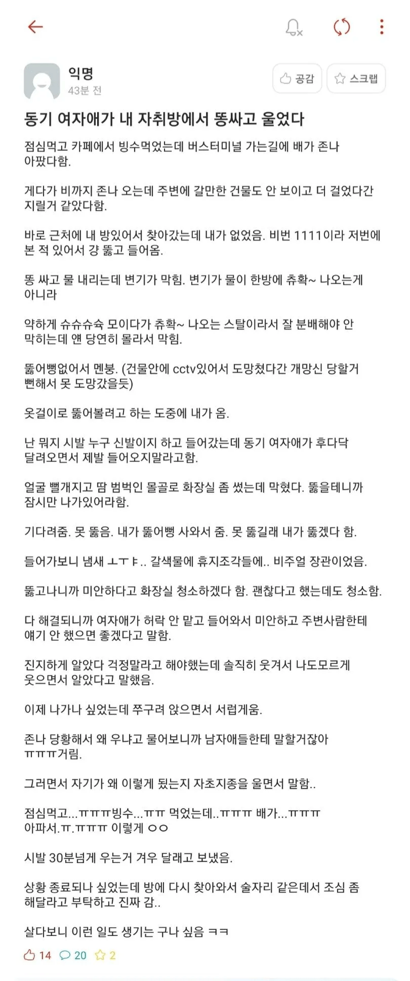 유머동기 여자애가 내 자취방에서 똥싸고 울었다위키뉴스 기자입력북마크공유가글자크기프린트댓글동기 여자애가 내 자취방에서 ㄸ싸고 울었다 위키뉴스 기자[email protected]카카오톡페이스북트위터밴드URL복사