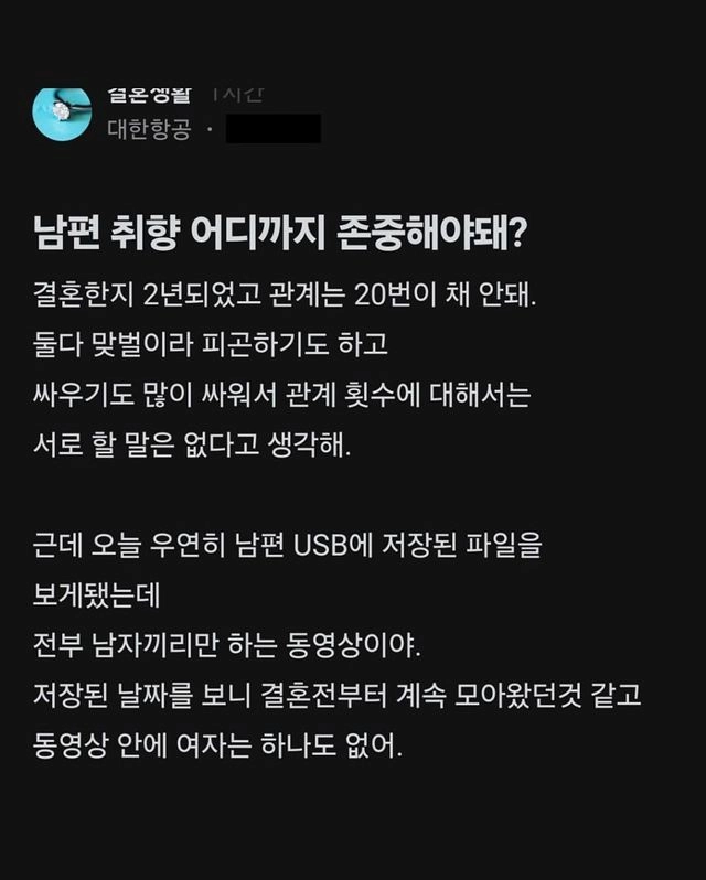 리와인드뉴스남편 취향을 알게된 승무원 아내의 고민위키뉴스 기자입력북마크공유가글자크기프린트댓글 남편 취향을 알게된 승무원 아내의 고민 위키뉴스 기자[email protected]카카오톡페이스북트위터밴드URL복사