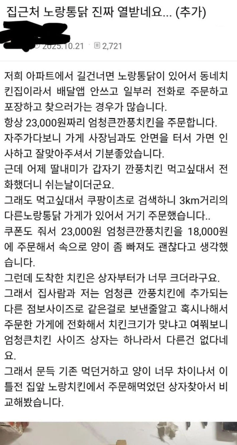 집앞 단골 치킨집에서 늘 포장해 오던 치킨의 비밀.jpg