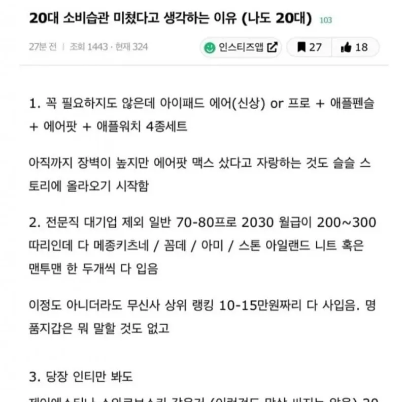 유머요즘 20대 소비습관 미쳤다고 생각하는 이유위키뉴스 기자입력북마크공유가글자크기프린트댓글 요즘 20대 소비습관 미쳤다고 생각하는 이유 솔직히 나 빼고 다 부자임. 위키뉴스 기자[email protected]카카오톡페이스북트위터밴드URL복사