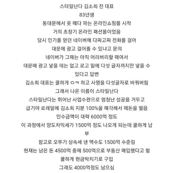 리와인드뉴스인터넷 쇼핑몰 업계 레전드 여자 사장님 ㄷㄷ위키뉴스 기자입력북마크공유가글자크기프린트댓글 인터넷 쇼핑몰 업계 레전드 여자 사장님 ㄷㄷ 현재는 지분 완전 매각하고 은퇴함평생 회장처럼살수있을듯 ㄷㄷ위키뉴스 기자[email protected]카카오톡페이스북트위터밴드URL복사