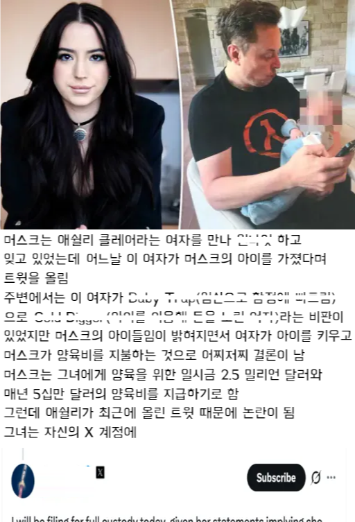 다만 약점이라면 아이 출산후 애쉴리가 아이의 주 양육자 였으며 머스크는 지금까지 단 3번만 아이를 찾아 왔고