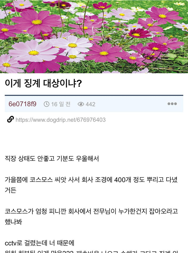 유머회사에 몰래 코스모스 씨 뿌렸는데 징계 대상이래위키뉴스 기자입력북마크공유가글자크기프린트댓글회사에 몰래 코스모스 씨 뿌렸는데 징계 대상이래 위키뉴스 기자[email protected]카카오톡페이스북트위터밴드URL복사