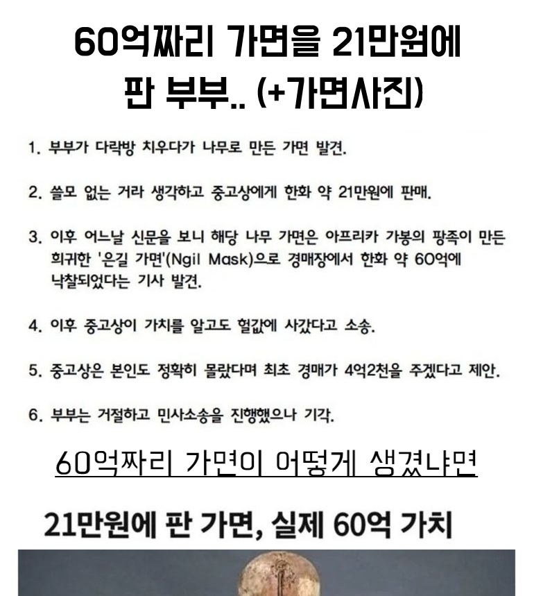 유머60억짜리 가면을 21만원에 판 부부.. (+가면사진)위키뉴스 기자입력북마크공유가글자크기프린트댓글60억짜리 가면을 21만원에 판 부부.. (+가면사진) 아프리카 가봉 팡족이 나무로 만든 60억원짜리 은길 가면 위키뉴스 기자[email protected]카카오톡페이스북트위터밴드URL복사