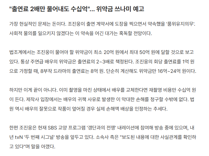조진웅, 천문학적 위약금 폭탄 맞나... 추산한 위약금 "최소 20억"