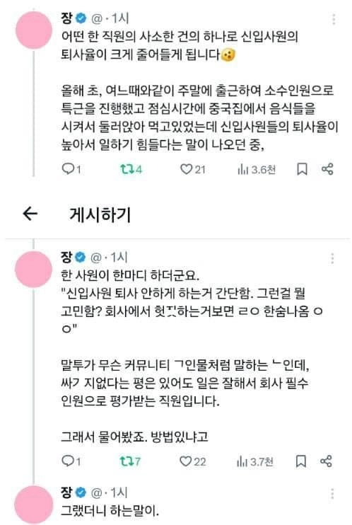 리와인드뉴스신입사원 퇴사율 극적으로 줄인 썰 ㄷㄷ위키뉴스 기자입력북마크공유가글자크기프린트댓글신입사원 퇴사율 극적으로 줄인 썰 ㄷㄷ ㄹㅇ 팩트임..위키뉴스 기자[email protected]카카오톡페이스북트위터밴드URL복사
