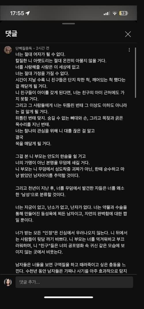 유머좀 많이 섬뜩한 트젠 유튜버 댓글 ㄷㄷㄷ위키뉴스 기자입력북마크공유가글자크기프린트댓글좀 많이 섬뜩한 트젠 유튜버 댓글 위키뉴스 기자[email protected]카카오톡페이스북트위터밴드URL복사
