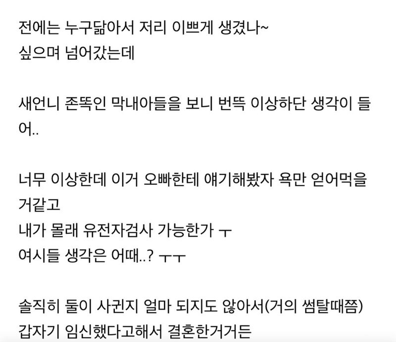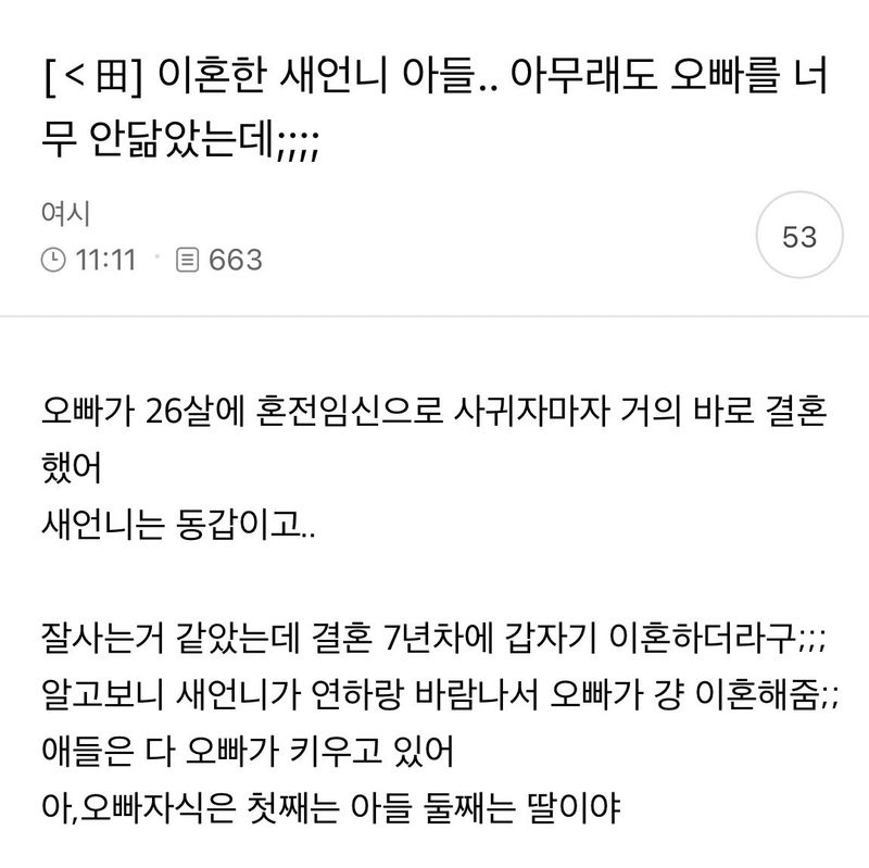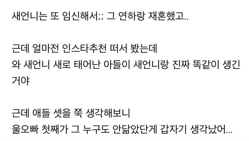 유머이혼한 새언니 아들... 오빠랑 너무 안 닮았는데위키뉴스 기자입력북마크공유가글자크기프린트댓글이혼한 새언니 아들.. 오빠랑 너무 안 닮았는데;; 위키뉴스 기자[email protected]카카오톡페이스북트위터밴드URL복사