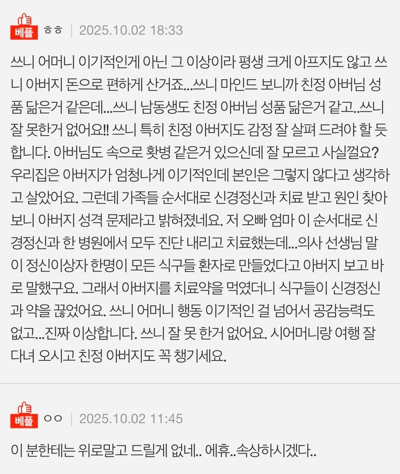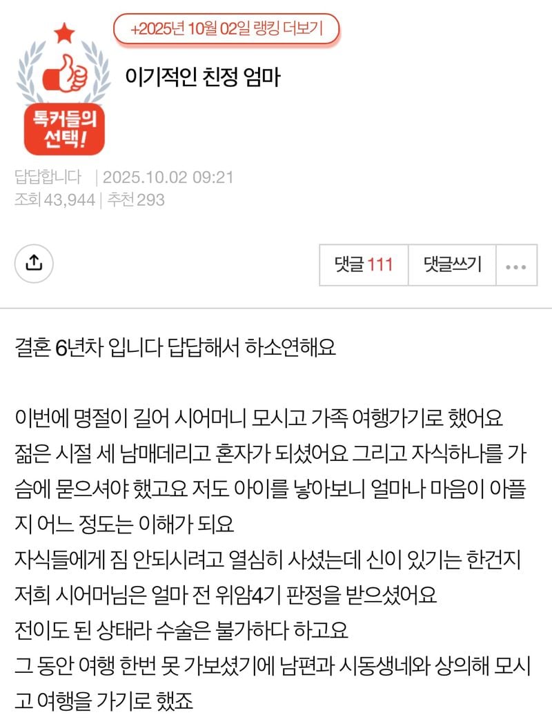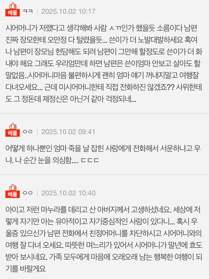 유머말기암 시어머니를 질투하는 친정엄마위키뉴스 기자입력북마크공유가글자크기프린트댓글소름) 말기암 시어머니 질투하는 친정엄마 위키뉴스 기자[email protected]카카오톡페이스북트위터밴드URL복사