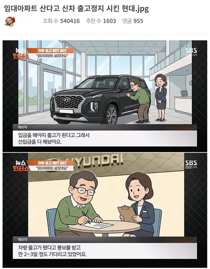 리와인드뉴스임대아파트 산다고 신차 출고정지 시킨 현대.jpg위키뉴스 기자입력북마크공유가글자크기프린트댓글 임대아파트 산다고 신차 출고정지 시킨 현대.jpg 엔카에는 주행거리 82km 출고가 6386만원 차량이 8500만원에 올라와 있음위키뉴스 기자[email protected]카카오톡페이스북트위터밴드URL복사