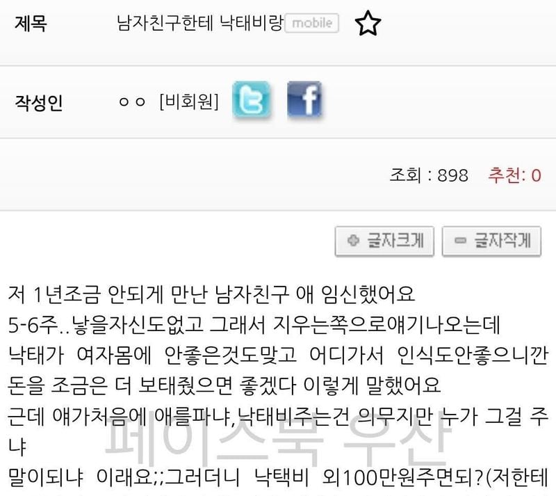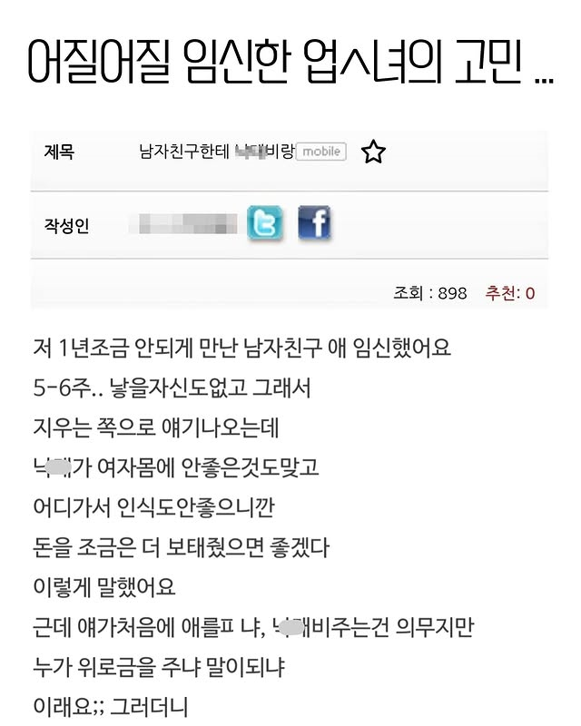 유머어질어질 임신한 업ㅅ녀의 고민위키뉴스 기자입력북마크공유가글자크기프린트댓글임신했는데 남자친구가 중절비용을… 위키뉴스 기자[email protected]카카오톡페이스북트위터밴드URL복사