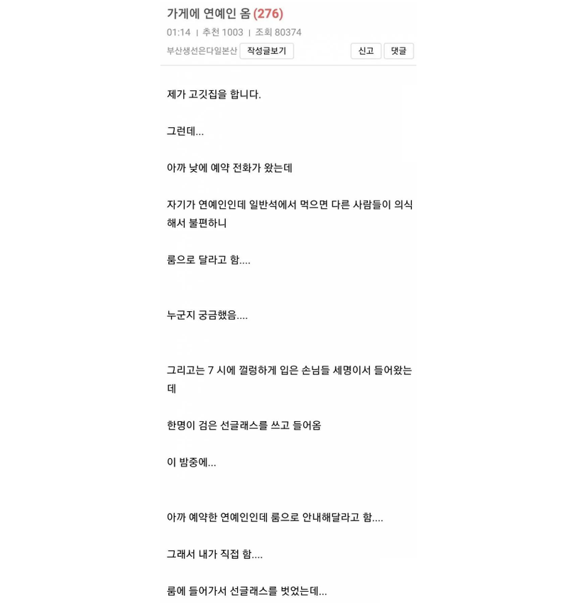 리와인드뉴스연예인병 걸린 연예인 손님 온 썰위키뉴스 기자입력북마크공유가글자크기프린트댓글 연예인병 걸린 연예인 손님 온 썰 위키뉴스 기자[email protected]카카오톡페이스북트위터밴드URL복사