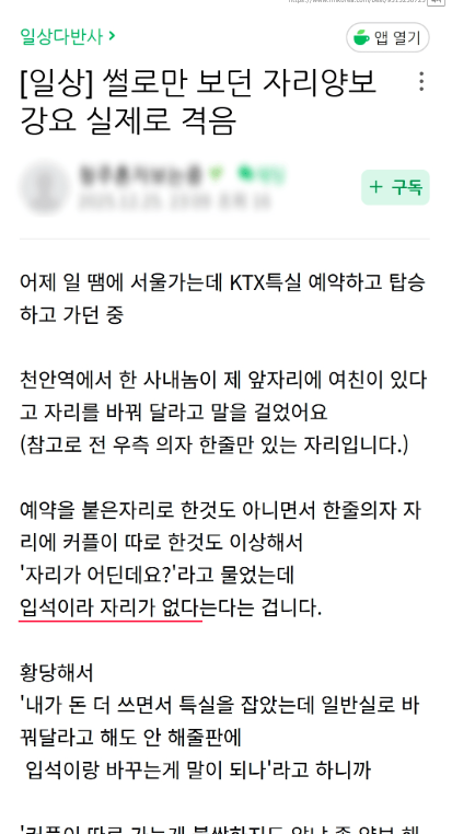 유머KTX 특실에서 자리양보 강요받은 사람위키뉴스 기자입력북마크공유가글자크기프린트댓글KTX 특실에서 자리양보 강요받은 사람 ??https://www.instiz.net/pt/7804912 위키뉴스 기자[email protected]카카오톡페이스북트위터밴드URL복사