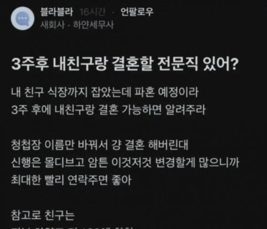 리와인드뉴스3주 후 내 친구랑 결혼할 전문직 있어?위키뉴스 기자입력북마크공유가글자크기프린트댓글 3주 후 내 친구랑 결혼할 전문직 있어? ?? 위키뉴스 기자[email protected]카카오톡페이스북트위터밴드URL복사