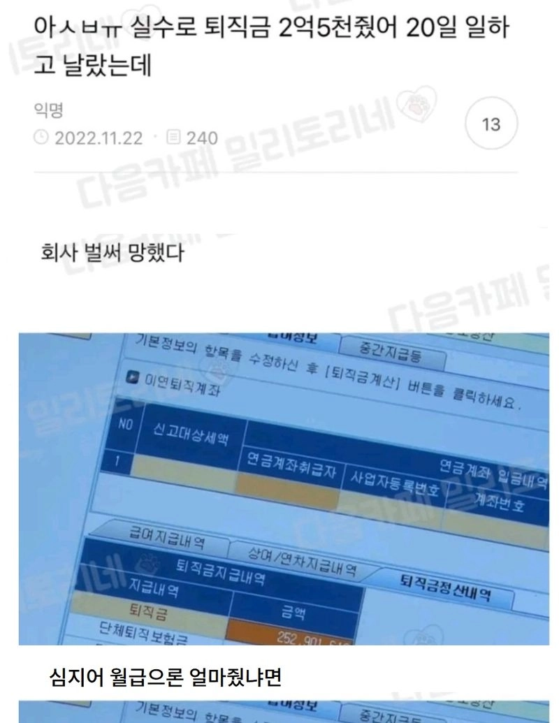 리와인드뉴스실수로 20일만에 추노한 직원 퇴직금 2억 5천을 줘버렸는데.JPG위키뉴스 기자입력북마크공유가글자크기프린트댓글 실수로 20일만에 추노한 직원 퇴직금 2억 5천을 줘버렸는데.JPG 그와중에 , 랑 . 구분 못하는거 실화냐? ㅋㅋ 아이피도 아니고위키뉴스 기자[email protected]카카오톡페이스북트위터밴드URL복사