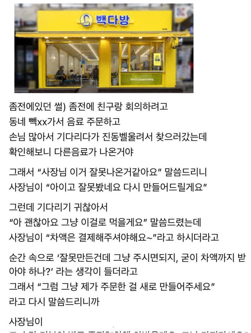 리와인드뉴스음료 제조 실수한 카페 사장님의 선택.jpg위키뉴스 기자입력북마크공유가글자크기프린트댓글 음료 제조 실수한 카페 사장님의 선택.jpg 음료값 손해 안 보려다가 손님 잃어버리기 ㄷㄷㄷ 위키뉴스 기자[email protected]카카오톡페이스북트위터밴드URL복사