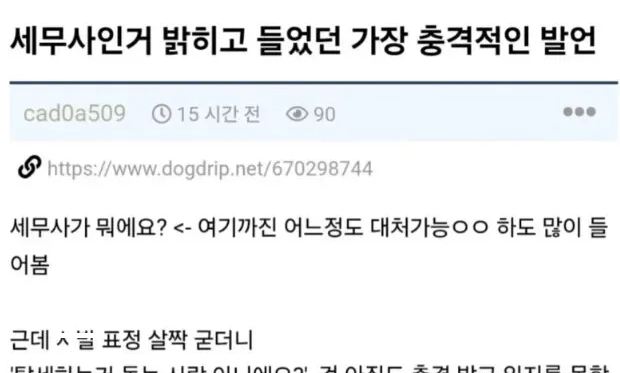 유머세무사가 들을 수 있는 가장 충격적인 질문 ㅋㅋㅋㅋ위키뉴스 기자입력북마크공유가글자크기프린트댓글 세무사가 들을 수 있는 가장 충격적인 질문 ㅋㅋㅋㅋ실패하면 탈세 성공하면 절세 아입니까!!! 위키뉴스 기자[email protected]카카오톡페이스북트위터밴드URL복사