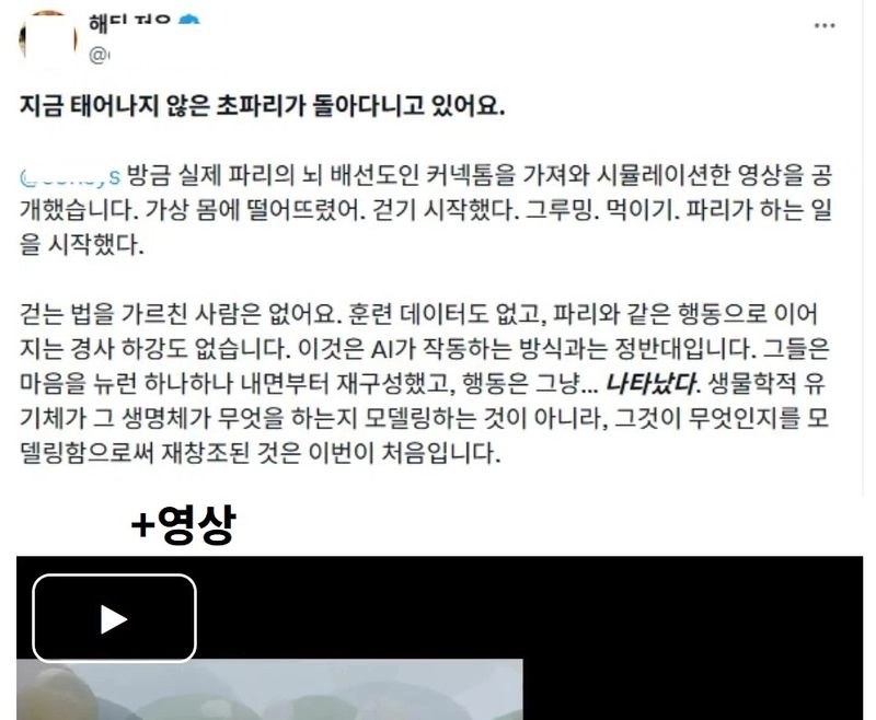 그냥 초파리 뇌 배선도 그대로 유니티 엔진에 넣으니까 진짜 초파리처럼 행동한다고 함