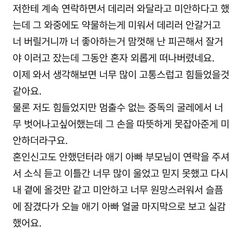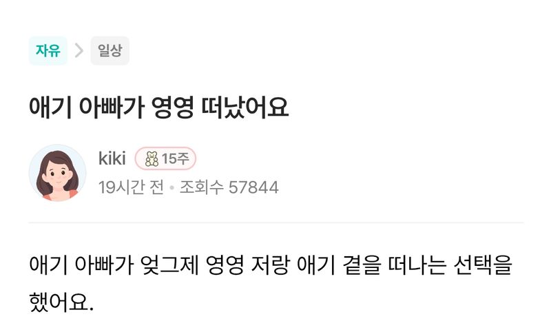 유머애기 아빠가 영영 떠났어요(+추가)위키뉴스 기자입력북마크공유가글자크기프린트댓글애기 아빠가 영영 떠났어요(+추가) 위키뉴스 기자[email protected]카카오톡페이스북트위터밴드URL복사