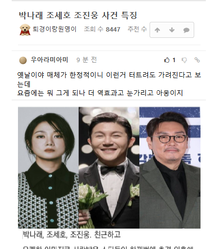유머박나래 조세호 조진웅 사건의 특징위키뉴스 기자입력북마크공유가글자크기프린트댓글박나래 조세호 조진웅 사건의 특징위키뉴스 기자[email protected]카카오톡페이스북트위터밴드URL복사
