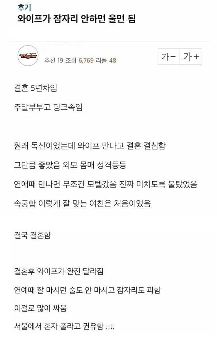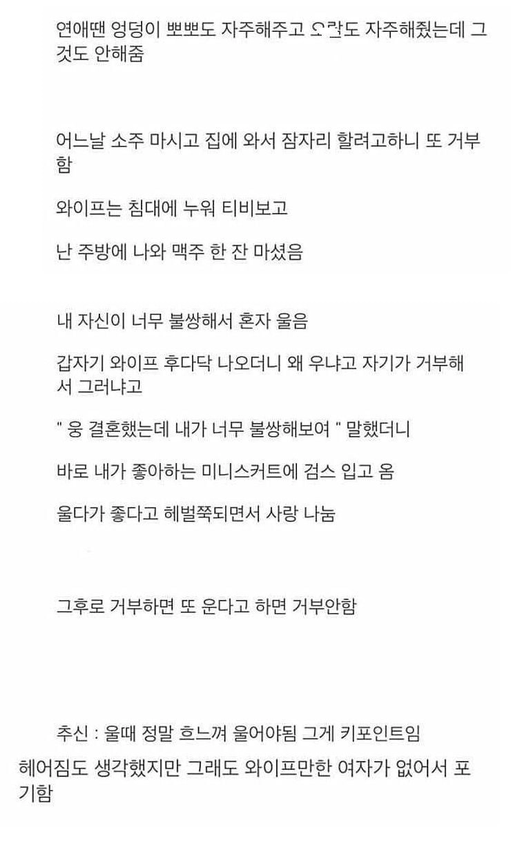 리와인드뉴스아내와 잠자리 안한지 2년... 며칠전 울었다위키뉴스 기자입력북마크공유가글자크기프린트댓글 아내와 잠자리 안한지 2년 며칠전 울었다 위키뉴스 기자[email protected]카카오톡페이스북트위터밴드URL복사