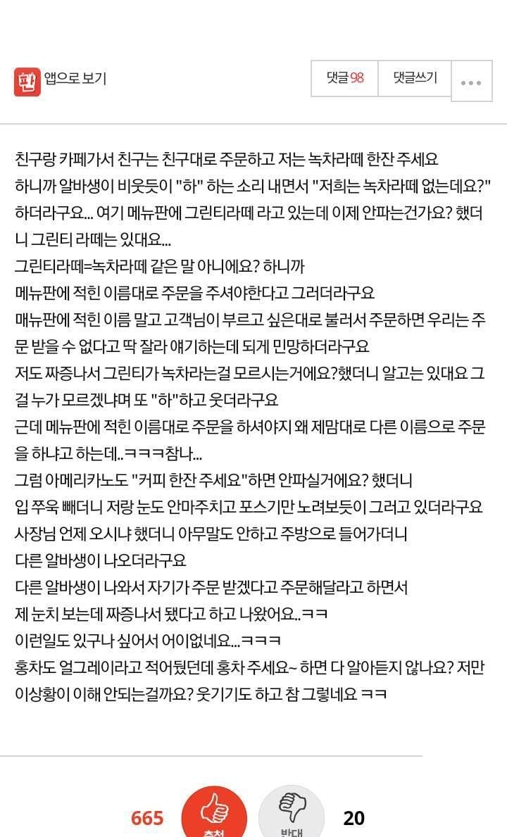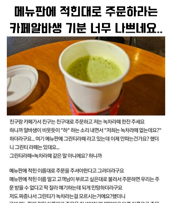 유머메뉴판에 적힌대로 주문하라는 카페알바생 기분 너무 나쁘네요..위키뉴스 기자입력북마크공유가글자크기프린트댓글메뉴판에 적힌대로 주문하라는 카페알바생.기분 너무 나쁘네요 위키뉴스 기자[email protected]카카오톡페이스북트위터밴드URL복사