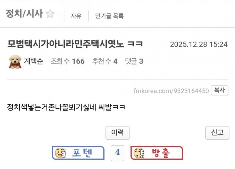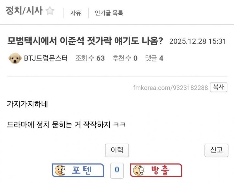 유머모범택시에 극우들이 발작하는 이유ㅋㅋ위키뉴스 기자입력북마크공유가글자크기프린트댓글모범택시에 극우들이 발작하는 이유ㅋㅋ 위키뉴스 기자[email protected]카카오톡페이스북트위터밴드URL복사