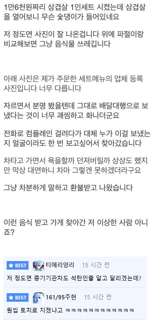 유머16,000원 삼겹살 1인 세트 받고 업체 찾아감위키뉴스 기자입력북마크공유가글자크기프린트댓글16,000원 삼겹살 1인 세트 받고 업체 찾아감.jpg 위키뉴스 기자[email protected]카카오톡페이스북트위터밴드URL복사