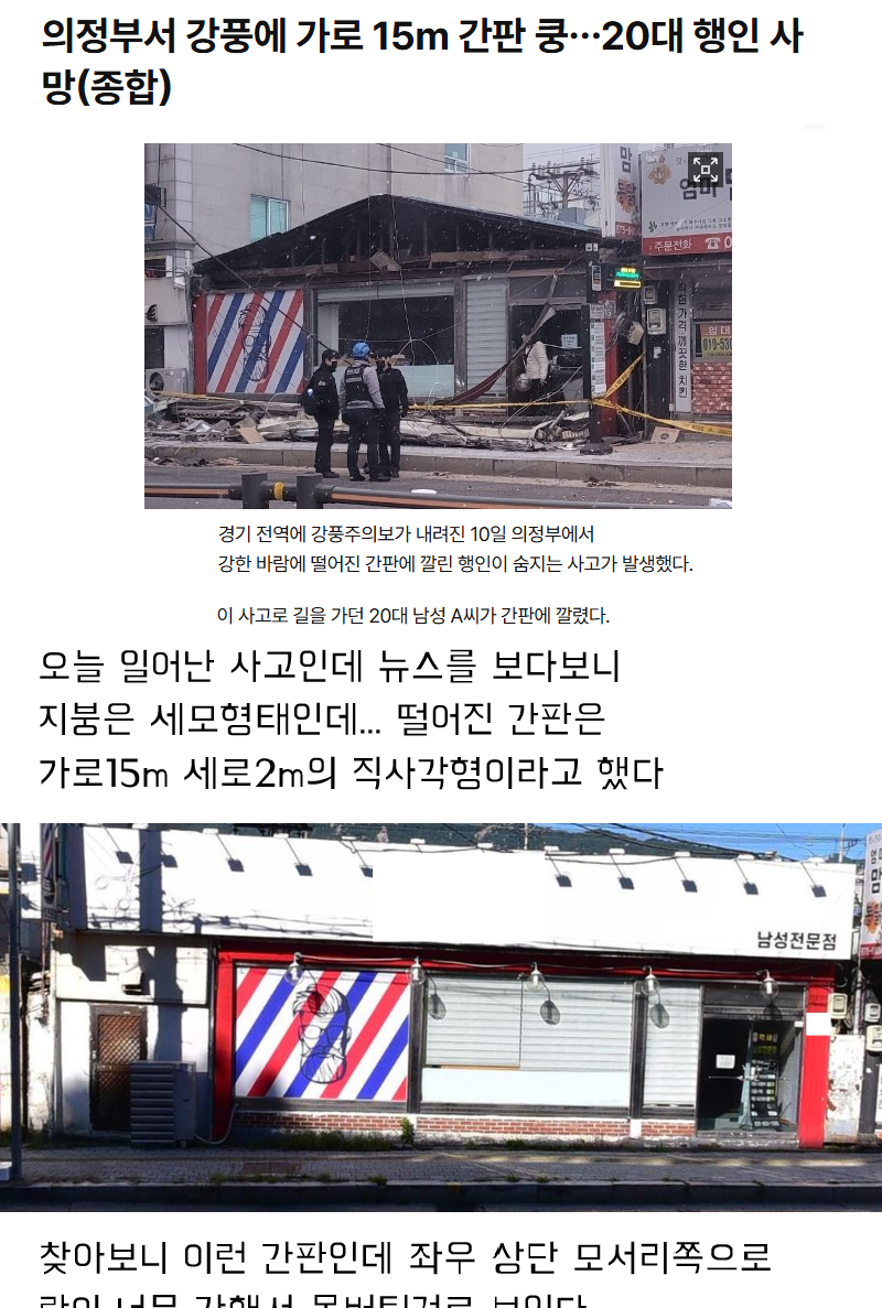 의정부에서 간판 떨어져 20대 사망한 사건을 본 남자