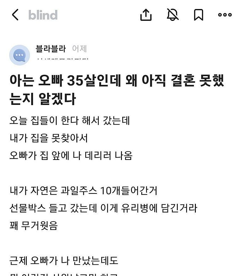 유머아는오빠 35살에 왜 결혼 못하는지알겠다위키뉴스 기자입력북마크공유가글자크기프린트댓글아는오빠 35살에 왜 결혼 못하는지알겠다 위키뉴스 기자[email protected]카카오톡페이스북트위터밴드URL복사