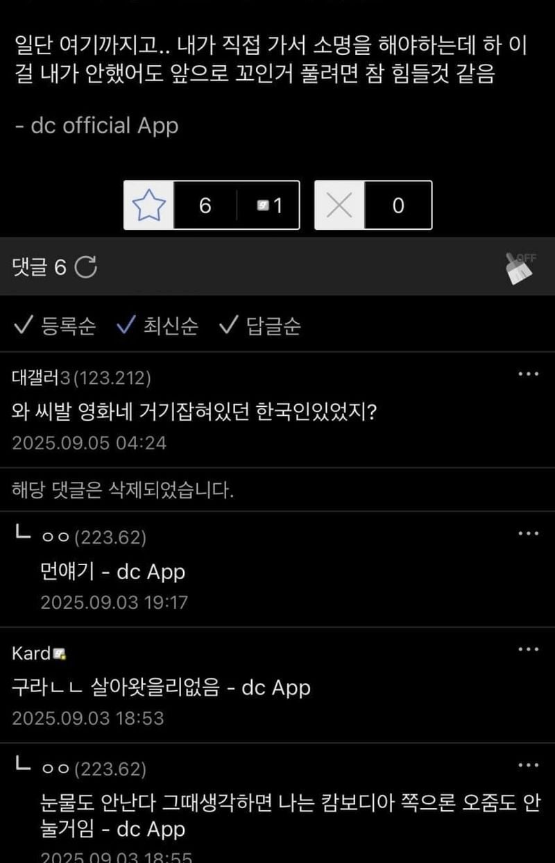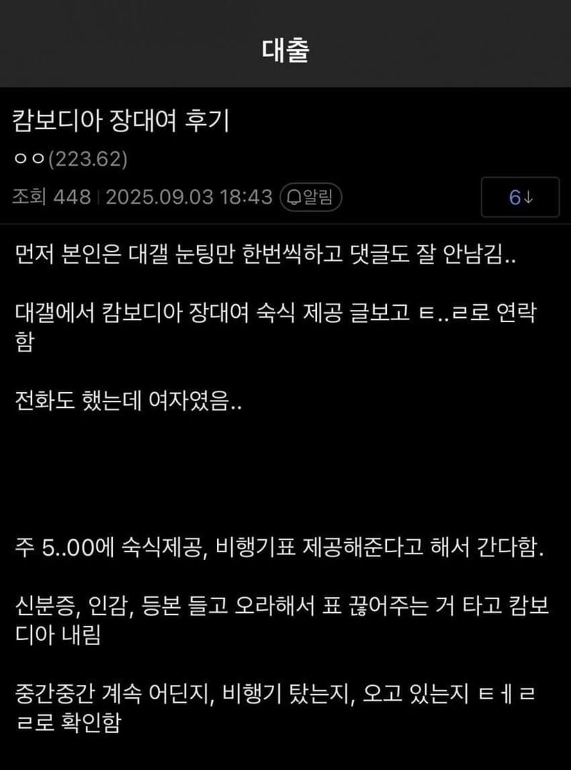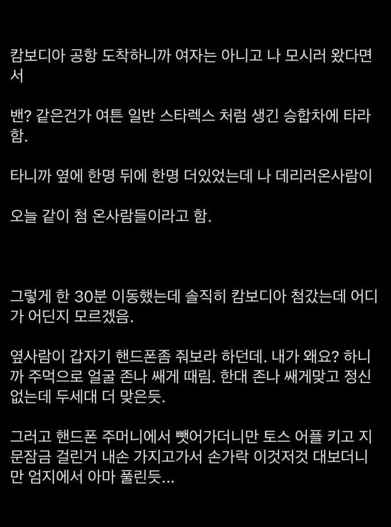유머캄보디아 범ㅈ단지에 잡혀있다가 탈출한 디시인 후기위키뉴스 기자입력북마크공유가글자크기프린트댓글지난 9월에 올라온 캄보디아 범죄단지 잡혀갔다가 탈출한 디시인 후기 위키뉴스 기자[email protected]카카오톡페이스북트위터밴드URL복사