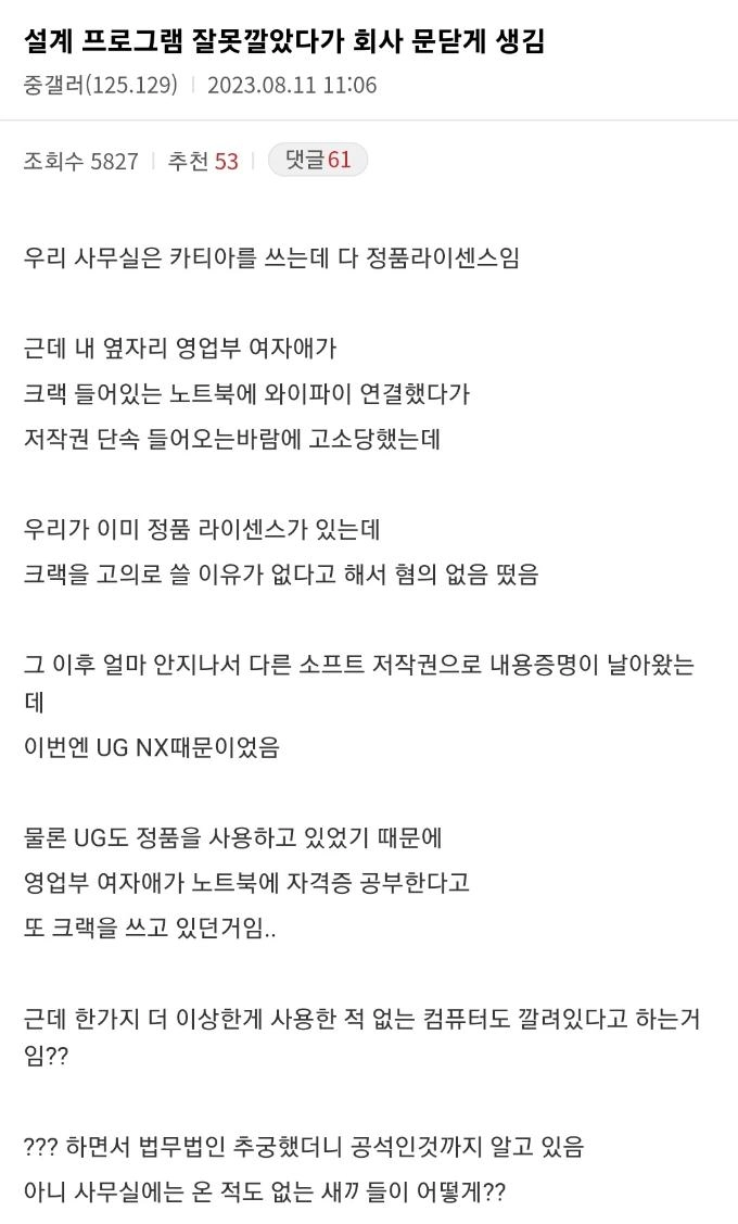 유머설계 프로그램 잘못 깔았다가 회사 문닫게 생김ㄷㄷ위키뉴스 기자입력북마크공유가글자크기프린트댓글설계 프로그램 잘못 깔았다가 회사 문닫게 생김ㄷㄷ 위키뉴스 기자[email protected]카카오톡페이스북트위터밴드URL복사