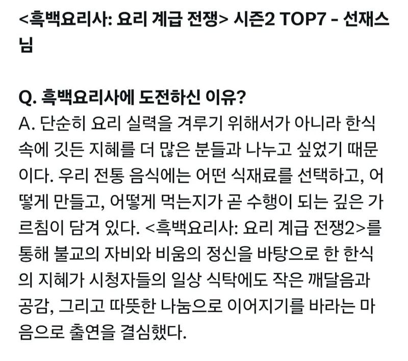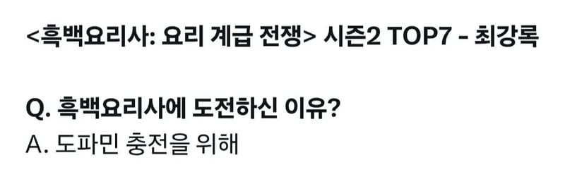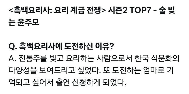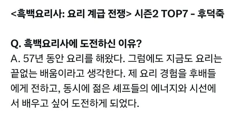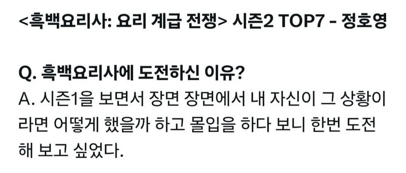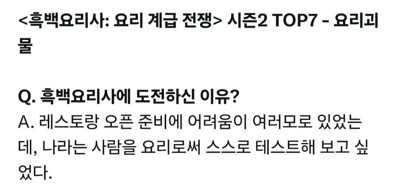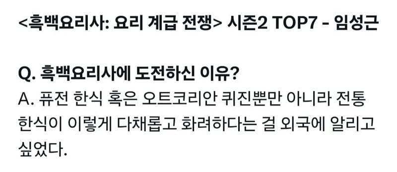 유머스포) 흑백요리사2에 도전한 이유를 밝힌 최강록위키뉴스 기자입력북마크공유가글자크기프린트댓글스포) 흑백요리사2에 도전한 이유를 밝힌 최강록 그리고 최강록의 답변위키뉴스 기자[email protected]카카오톡페이스북트위터밴드URL복사
