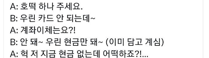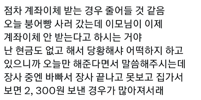 유머붕어빵 점점 계좌이체 안받는 가게 늘어남ㄷㄷ위키뉴스 기자입력북마크공유가글자크기프린트댓글점점 계좌이체 안받는 가게 늘어남 (+이유) 위키뉴스 기자[email protected]카카오톡페이스북트위터밴드URL복사