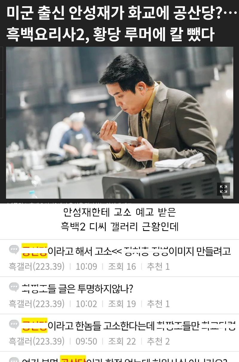 유머안성재한테 고소 예고 받은 흑백2 갤러리 근황위키뉴스 기자입력북마크공유가글자크기프린트댓글 안성재한테 고소 예고 받은 흑백2 갤러리 근황"우린 공산당이라고 한 적 없다! 화교라고만 했다!"(개념글 클리너 돌리면서)위키뉴스 기자[email protected]카카오톡페이스북트위터밴드URL복사