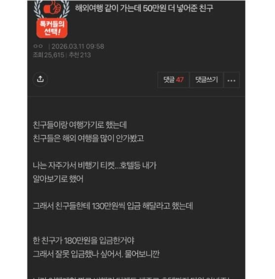 리와인드뉴스해외여행 같이 가는데 50만원 더 넣어준 친구위키뉴스 기자입력북마크공유가글자크기프린트댓글 해외여행 같이 가는데 50만원 더 넣어준 친구 나는 내차로 여행가는데 톨비 기름값까지 N빵 하더라그뒤로 그놈들이랑 여행 같이 안감위키뉴스 기자[email protected]카카오톡페이스북트위터밴드URL복사
