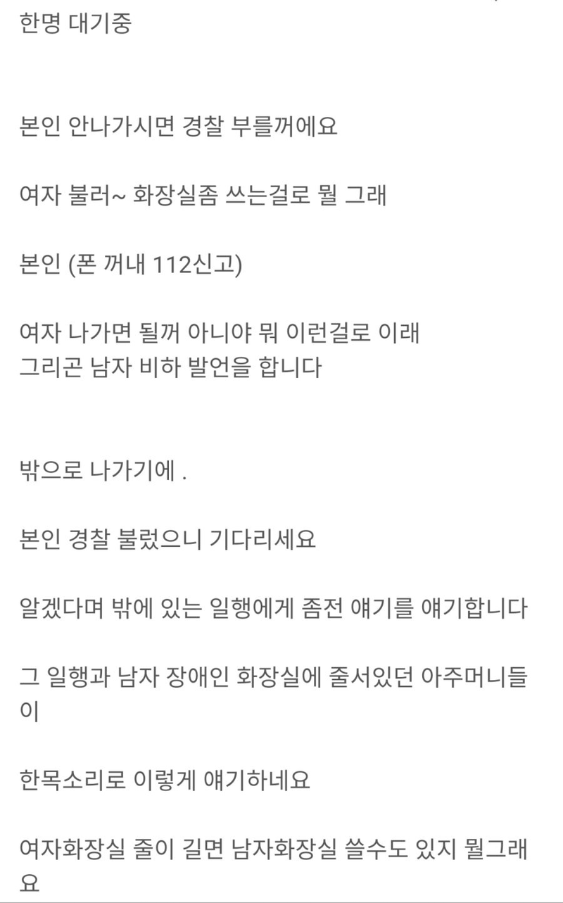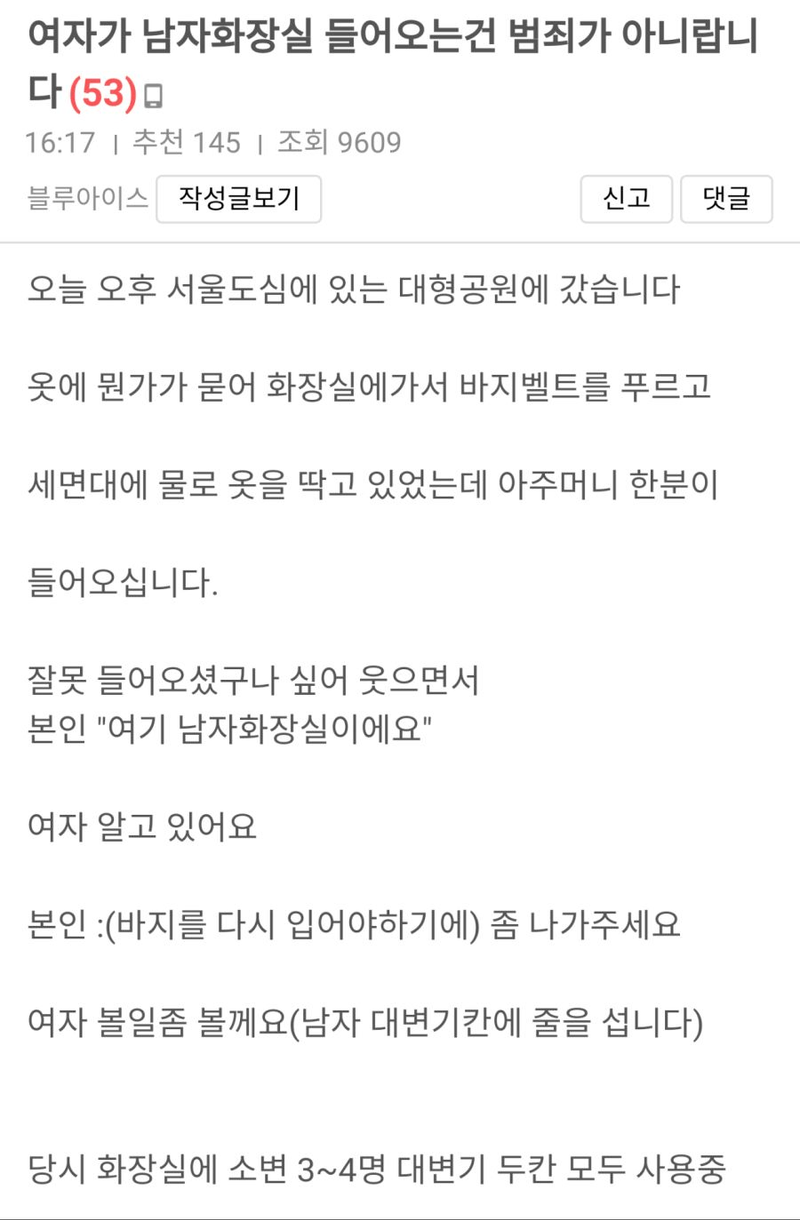 유머여자가 남자화장실 들어오면 ㅂ죄가 아니랍니다위키뉴스 기자입력북마크공유가글자크기프린트댓글여자가 남자화장실 들어오면 범죄가 아니랍니다 위키뉴스 기자[email protected]카카오톡페이스북트위터밴드URL복사