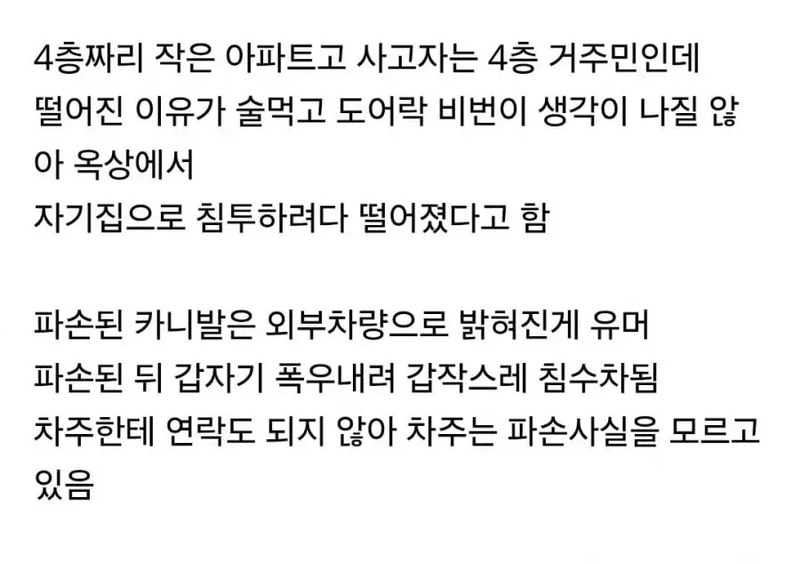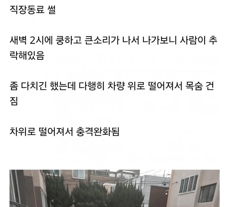 유머새벽에 쿵 소리에 나가보니 차 위에 사람이 떨어져있음위키뉴스 기자입력북마크공유가글자크기프린트댓글새벽에 쿵 소리에 나가보니 차위에 사람이 떨어져있음 위키뉴스 기자[email protected]카카오톡페이스북트위터밴드URL복사