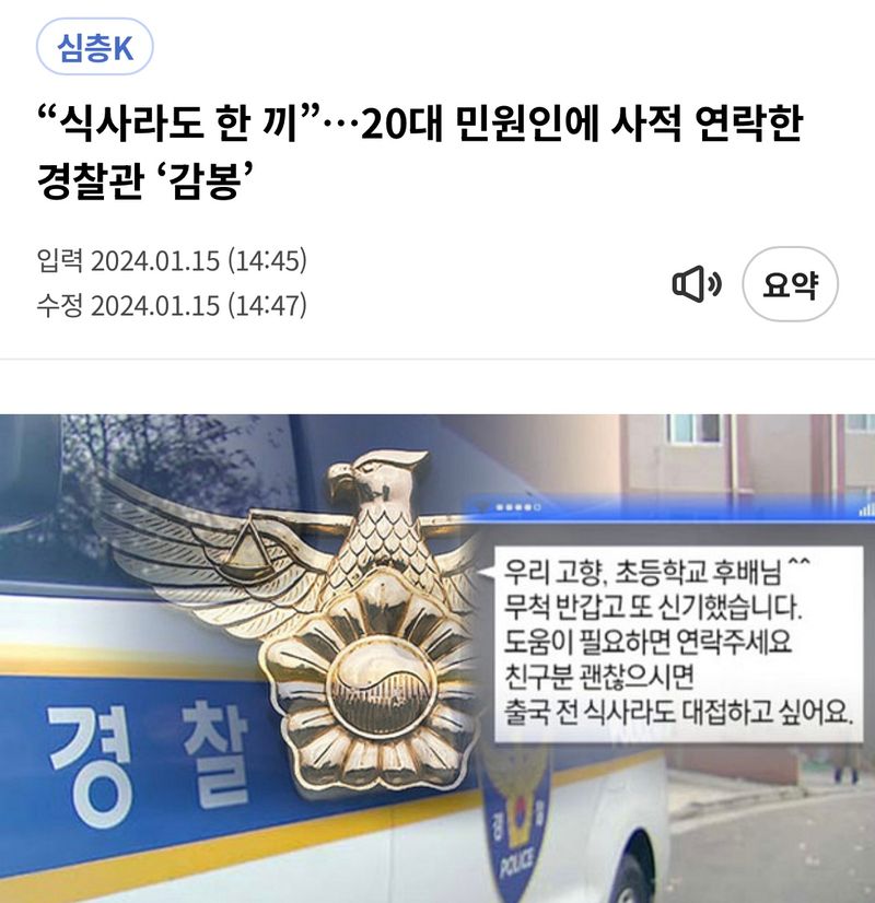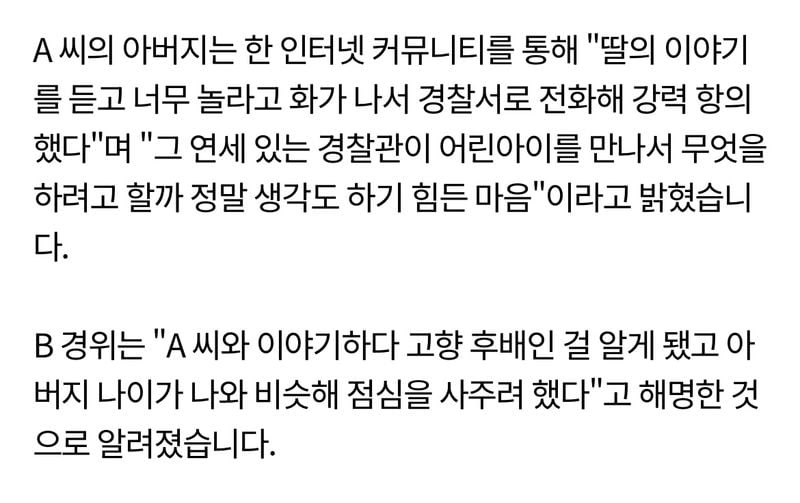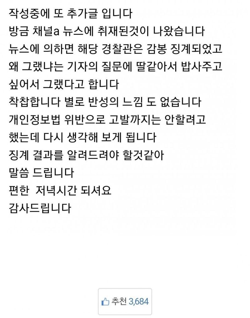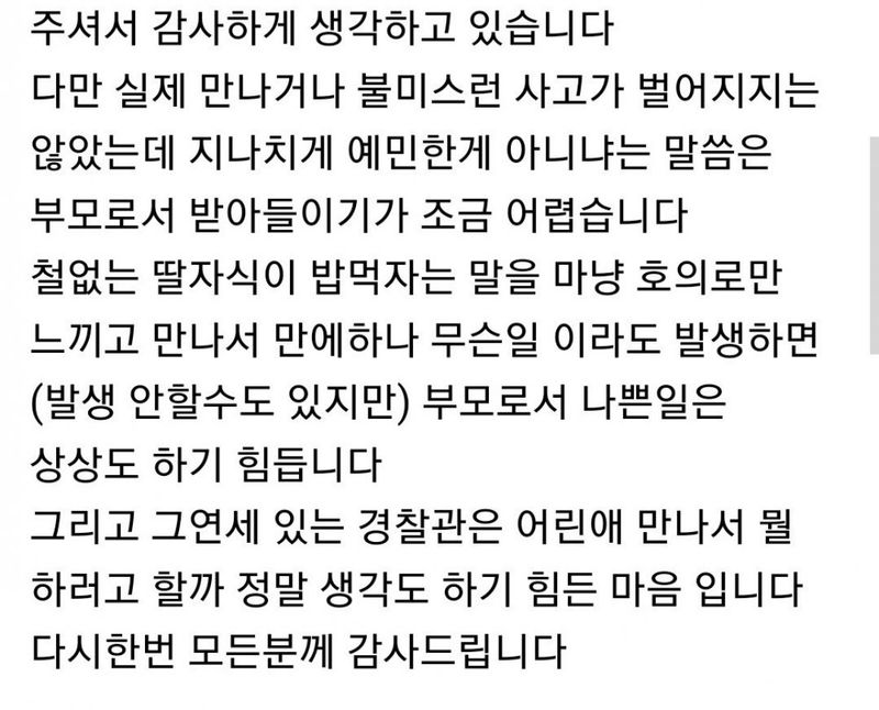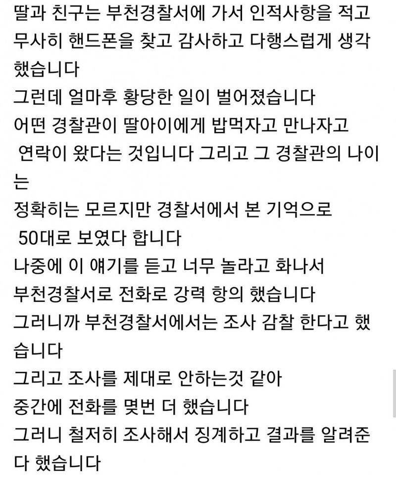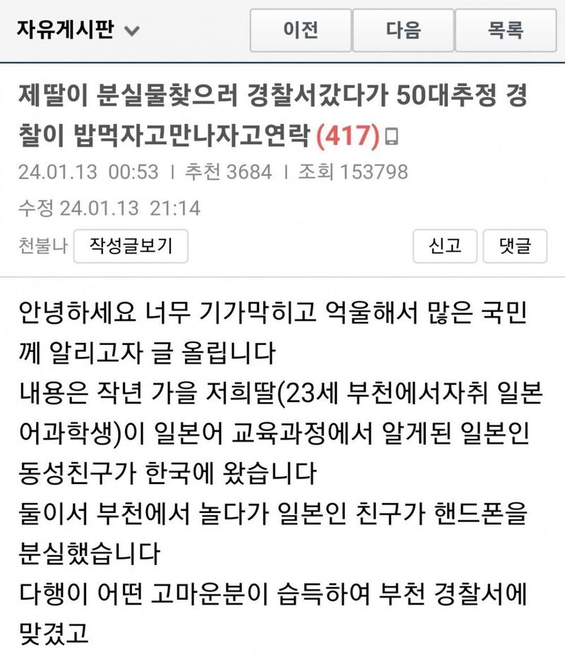 유머20대 딸이 분실물 찿으러 갔다가 50대 경찰한테 밥먹자는 연락을 받았습니다위키뉴스 기자입력북마크공유가글자크기프린트댓글제 딸이 분실물 찾으러 갔다가 50대 경찰한테 밥먹자고 연락을 받았습니다 +결말 위키뉴스 기자[email protected]카카오톡페이스북트위터밴드URL복사