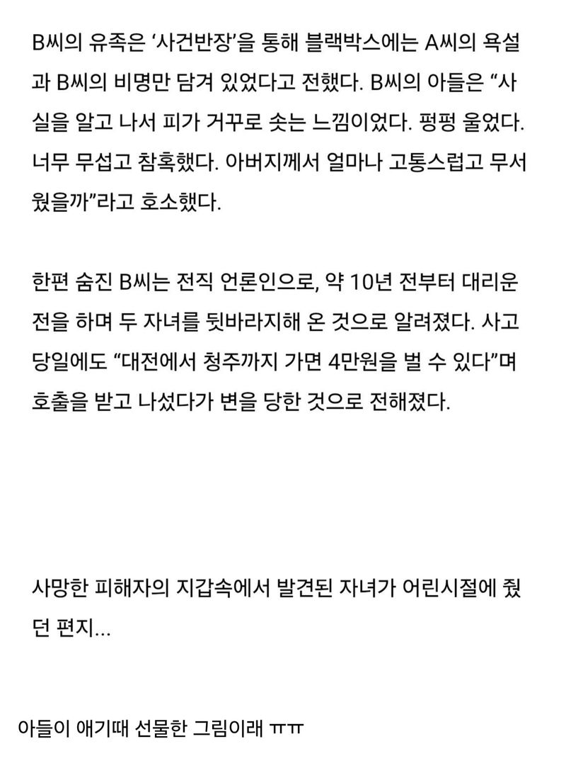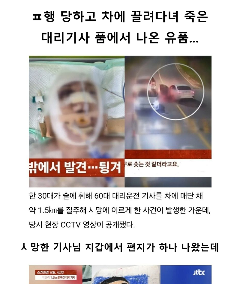 유머ㅍ행 당하고 차에 끌려다녀 죽은 대리기사 품에서 나온 유품...위키뉴스 기자입력북마크공유가글자크기프린트댓글폭행 당하고 차에 끌려다녀 죽은 대리기사 품에서 나온 유품 위키뉴스 기자[email protected]카카오톡페이스북트위터밴드URL복사