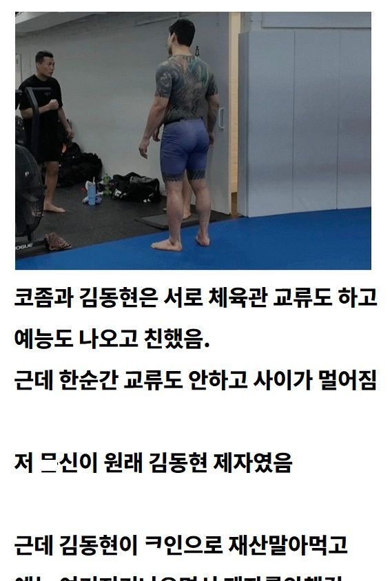 코좀과 김동현은 서로 체육관 교류도 하고 예능도 나오고 친했음. 근데 한순간 교류도 안하고 사이가 멀어짐