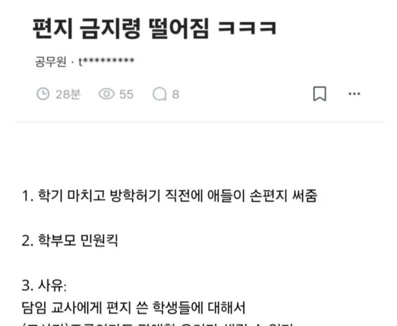 리와인드뉴스교사들은 학생들에게 편지 받지 말라고 금지령 떨어짐 ㅋㅋㅋㅋ위키뉴스 기자입력북마크공유가글자크기프린트댓글교사들은 학생들에게 편지 받지 말라고 금지령 떨어짐 ㅋㅋㅋㅋ 위키뉴스 기자[email protected]카카오톡페이스북트위터밴드URL복사