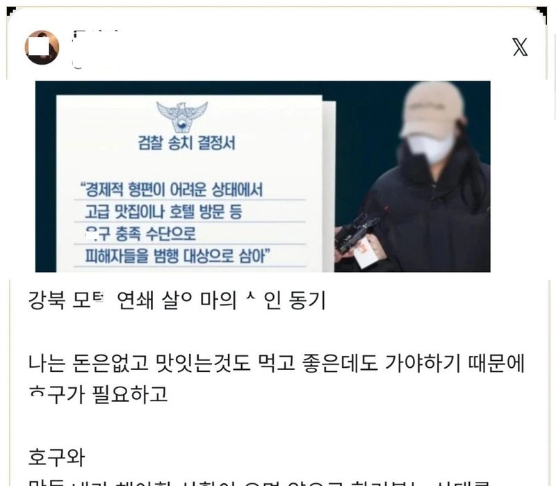 리와인드뉴스강북 모ㅌ 연쇄 살ㅇ마의 ㅅ인 동기 ㄷㄷ위키뉴스 기자입력북마크공유가글자크기프린트댓글 강북 모ㅌ 연쇄 살ㅇ마의 ㅅ인 동기 ㄷㄷ위키뉴스 기자[email protected]카카오톡페이스북트위터밴드URL복사