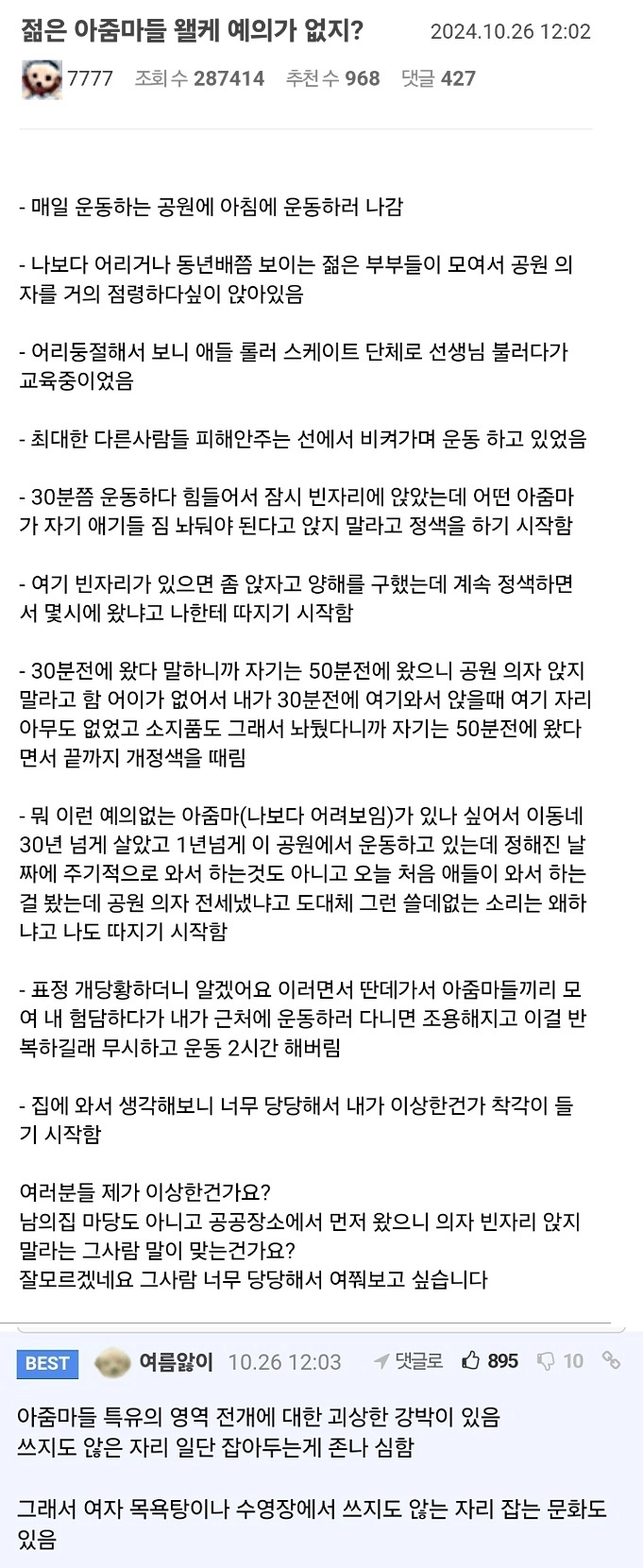 유머젊은 아줌마들 왤케 예의가 없지?위키뉴스 기자입력북마크공유가글자크기프린트댓글젊은 아줌마들 왤케 예의가 없지? 위키뉴스 기자[email protected]카카오톡페이스북트위터밴드URL복사
