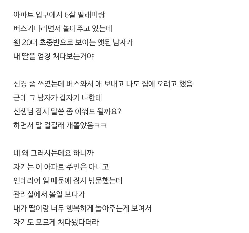 유머아파트 입구서 딸아이 쳐다보는 수상한 남자위키뉴스 기자입력북마크공유가글자크기프린트댓글아파트 입구서 딸아이 쳐다보는 수상한 남자 위키뉴스 기자[email protected]카카오톡페이스북트위터밴드URL복사